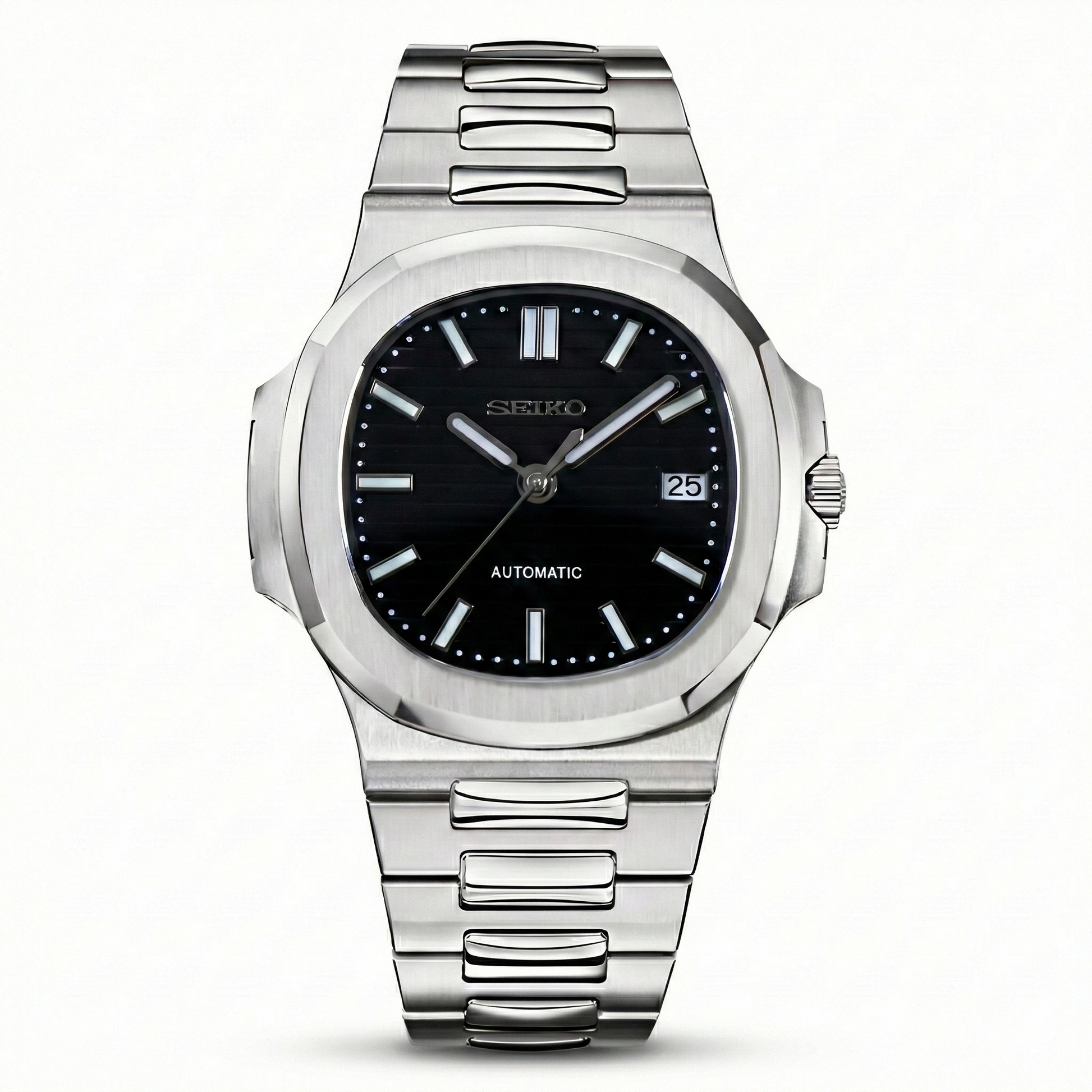 Inspired by the iconic Nautilus design and powered by the reliable Seiko NH35 automatic movement, this timepiece is hand-assembled for precision and style.
