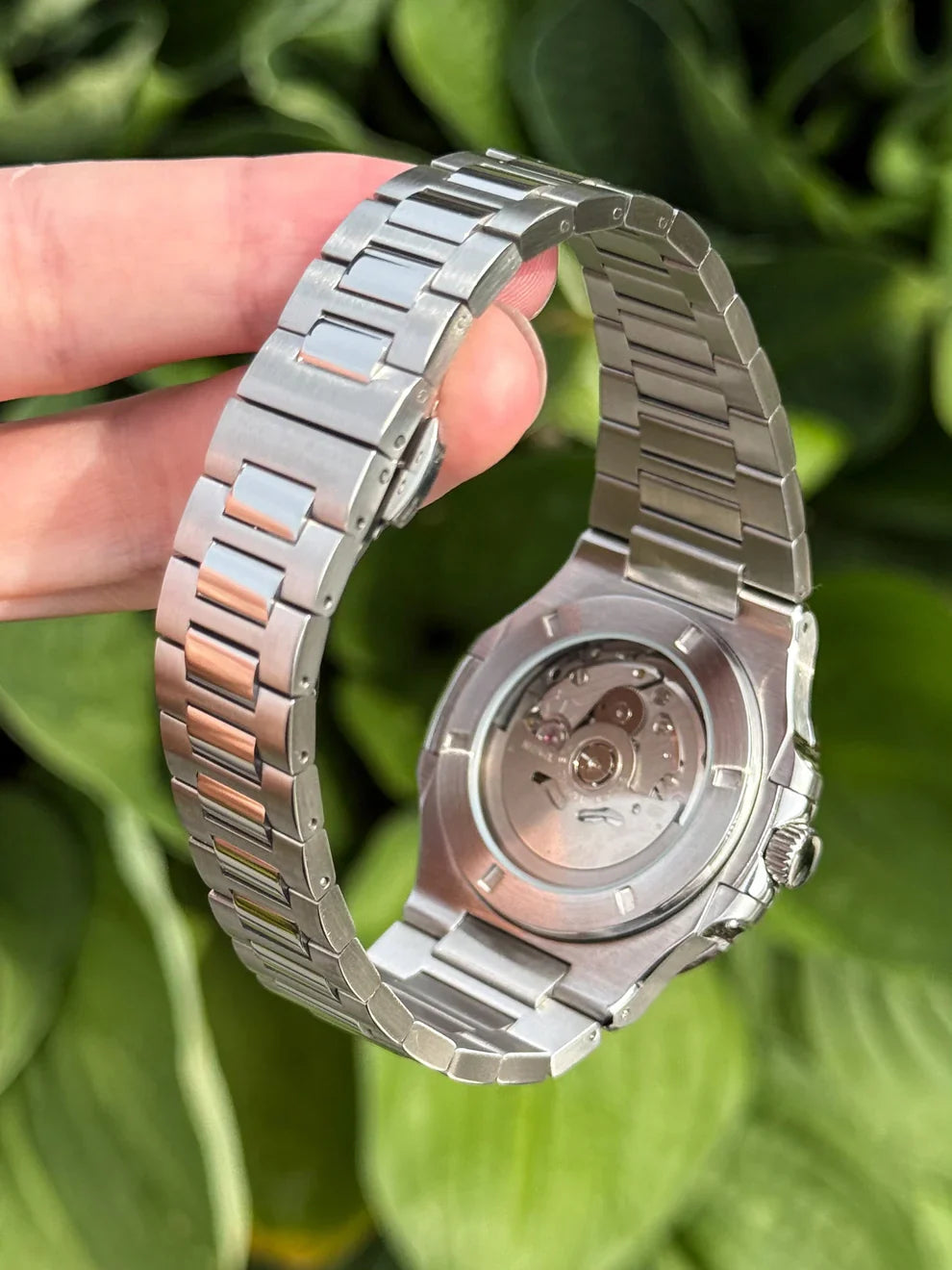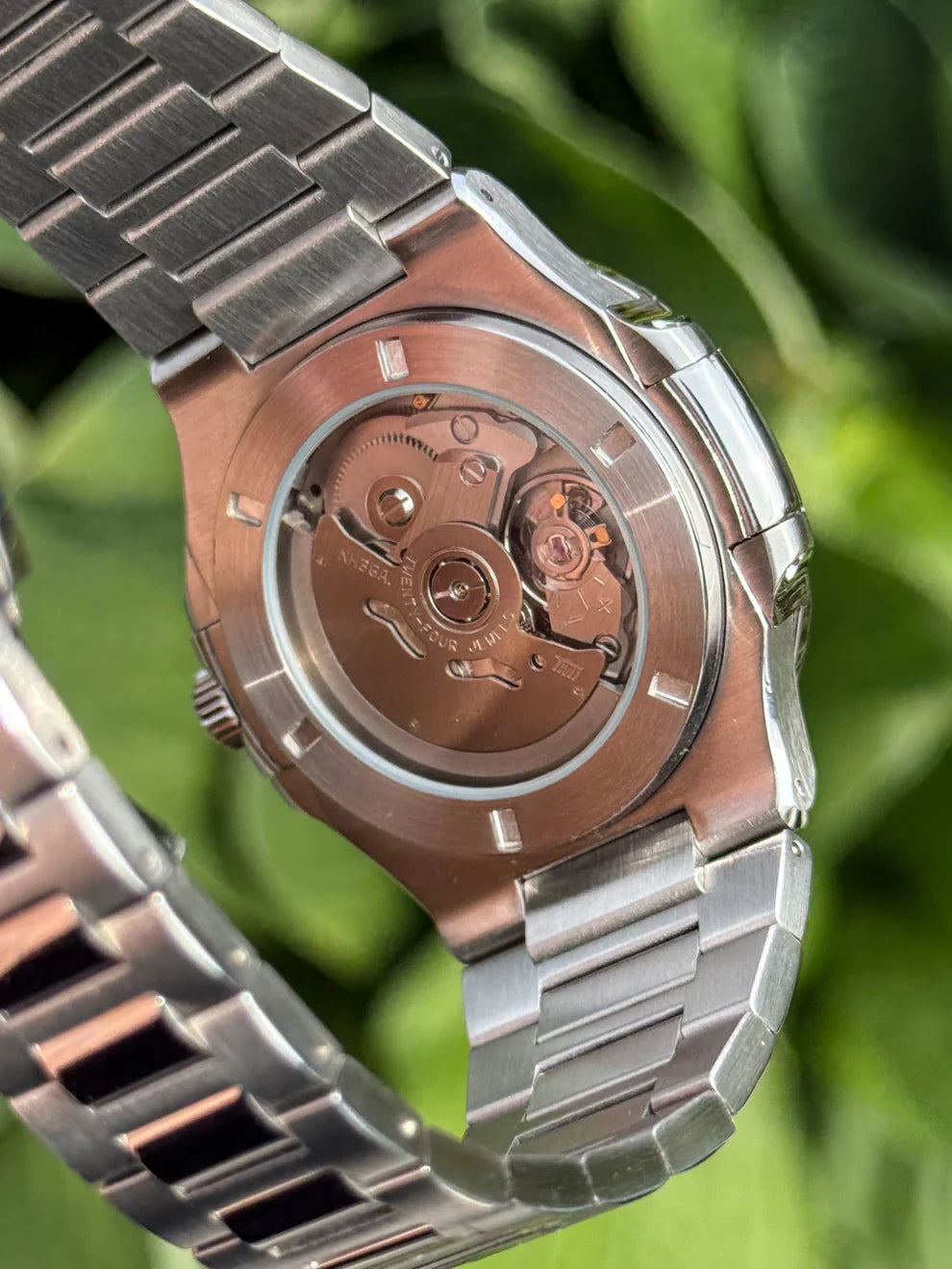 Inspired by the iconic Nautilus design and powered by the reliable Seiko NH35 automatic movement, this timepiece is hand-assembled for precision and style.